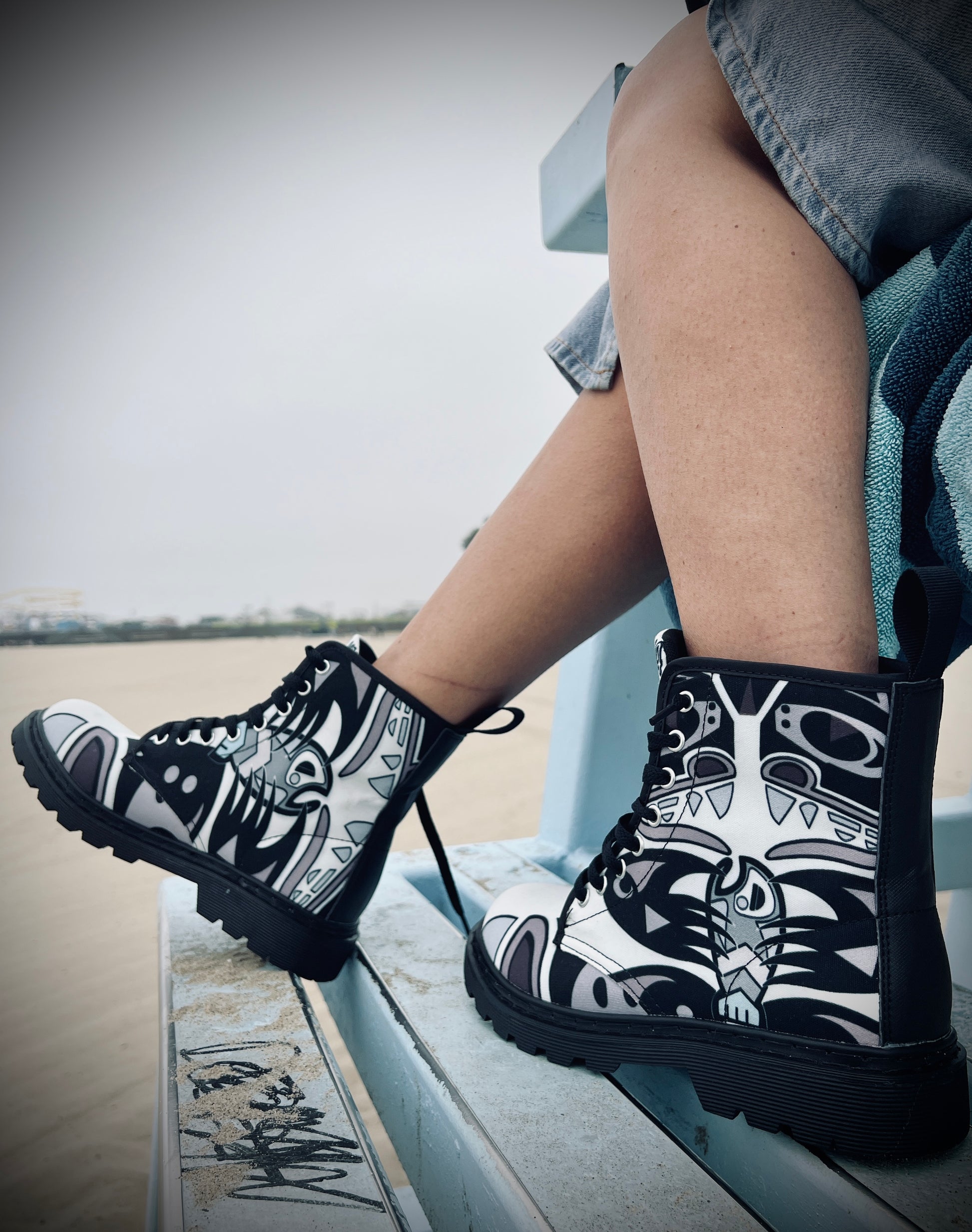 This Indigenous Bear (Noir) motif was inspired by mental health awareness and physical disabilities. The indigenous Bear symbolizes strength, courage and health. It has a special connection with nature and is seen as a guardian. Both a protector and healer. The Indigenous Bear is self-contained and strong-willed. Great causes need great designs! Reinvent your wardrobe and turn heads with every step in these stylish, digitally printed Art Boots. These classic, artsy canvas boots will be a great addition to your wardrobe while championing wonderful causes.