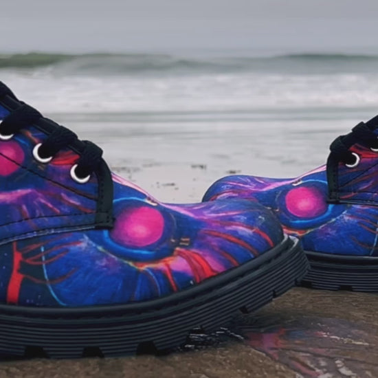 Fire, is one of nature's elements. It's a symbol of purification and renewal. Fire rituals have been performed as a means of purification, symbolizing the cleansing of the soul and the renewal of life. Influenced by Domestic Violence Awareness, these digitally printed Art Boots, reflect the belief in the transformative power of fire. Great causes need great designs! Reinvent your wardrobe and turn heads with every step in these stylish and artsy canvas boots. These classic boots will be a great addition to your wardrobe while championing wonderful causes.