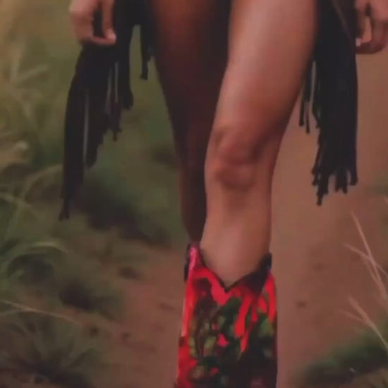 Step into the mystique of the desert twilight with these Serpent Moonrise upcycled, hand-painted boots - a wearable work of art for the bold and the wild at heart. Hand-painted with breathtaking detail: a sinuous serpent weaving through sagebrush, and a fiery sunset sky melting into deep desert night with a crescent moon. The serpent symbolizes transformation and power, while the crescent moon whispers of intuition and mystery - making these boots more than footwear; they're a statement of spirit. Perfect for pairing with flowing dresses, denim, or festival fits.