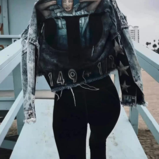 This upcycled, 100% cotton Thrilled denim jacket symbolizes a nurse on the verge of her psychological threshold collapsing. The term 5150 is the section number of the California Welfare and Institutions Code. It refers to a 72-hour involuntary hold in a hospital or mental health facility, due to person deemed harmful to themselves or to others. With a "See no evil, hear no evil, speak no evil" theme, this design represents a fictitious term 5149.5, symbolizing a nurse's physical, emotional, and spiritual disillusionment while working in mental health during the Pandemic. This item has been sold. Feeling Inspired? Contact us for a free consultation to discuss your next denim jacket design.